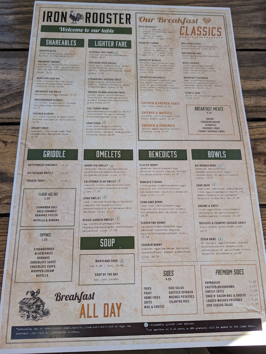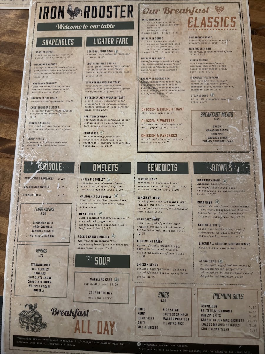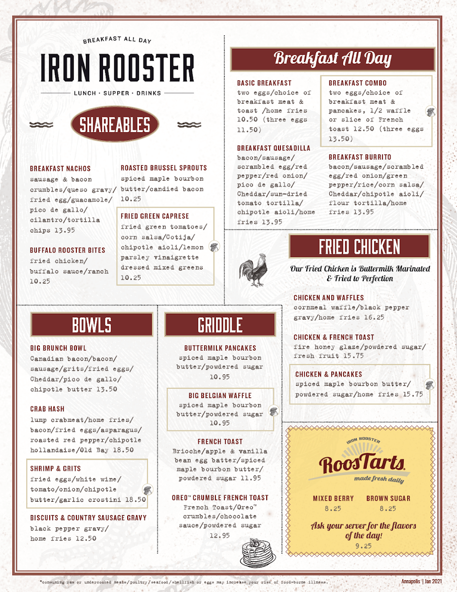 At Iron Rooster - Annapolis Menu, you'll find a delightful mix of comfort and creativity in every dish. Whether you're craving a hearty breakfast or a satisfying lunch, this menu has something for everyone. From mouthwatering omelets to decadent homemade waffles, the options are endless. The restaurant’s dedication to fresh ingredients and bold flavors shines through in every bite, making it a go-to spot for anyone in the Annapolis area.