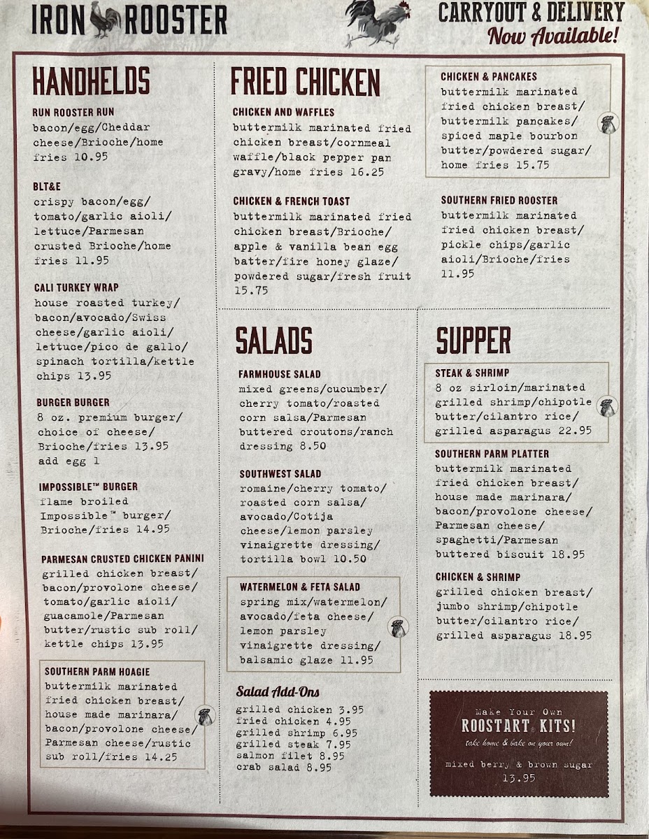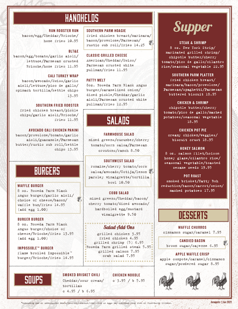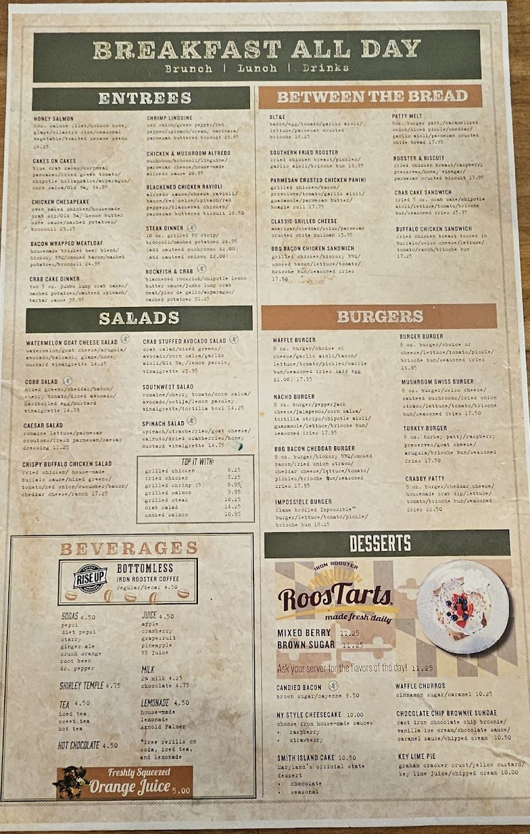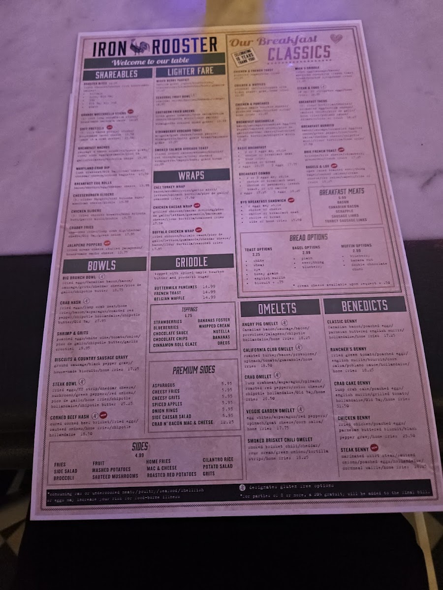 At Iron Rooster - Annapolis Menu, you'll find a delightful mix of comfort and creativity in every dish. Whether you're craving a hearty breakfast or a satisfying lunch, this menu has something for everyone. From mouthwatering omelets to decadent homemade waffles, the options are endless. The restaurant’s dedication to fresh ingredients and bold flavors shines through in every bite, making it a go-to spot for anyone in the Annapolis area.