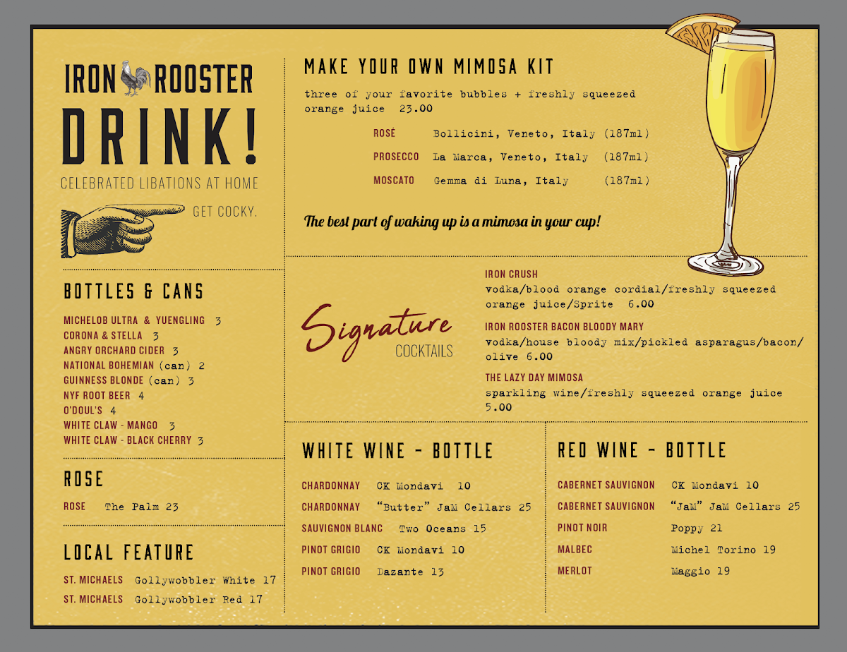 If you're in the mood for something classic, try the signature Rooster’s French Toast, or indulge in a savory skillet filled with your favorite ingredients. Don’t forget to pair it with a refreshing drink from their selection - whether it's a fresh juice or a unique cocktail, there's no shortage of options to complement your meal. Perfect for a relaxed meal with friends or family, the Iron Rooster - Annapolis Menu truly has it all.